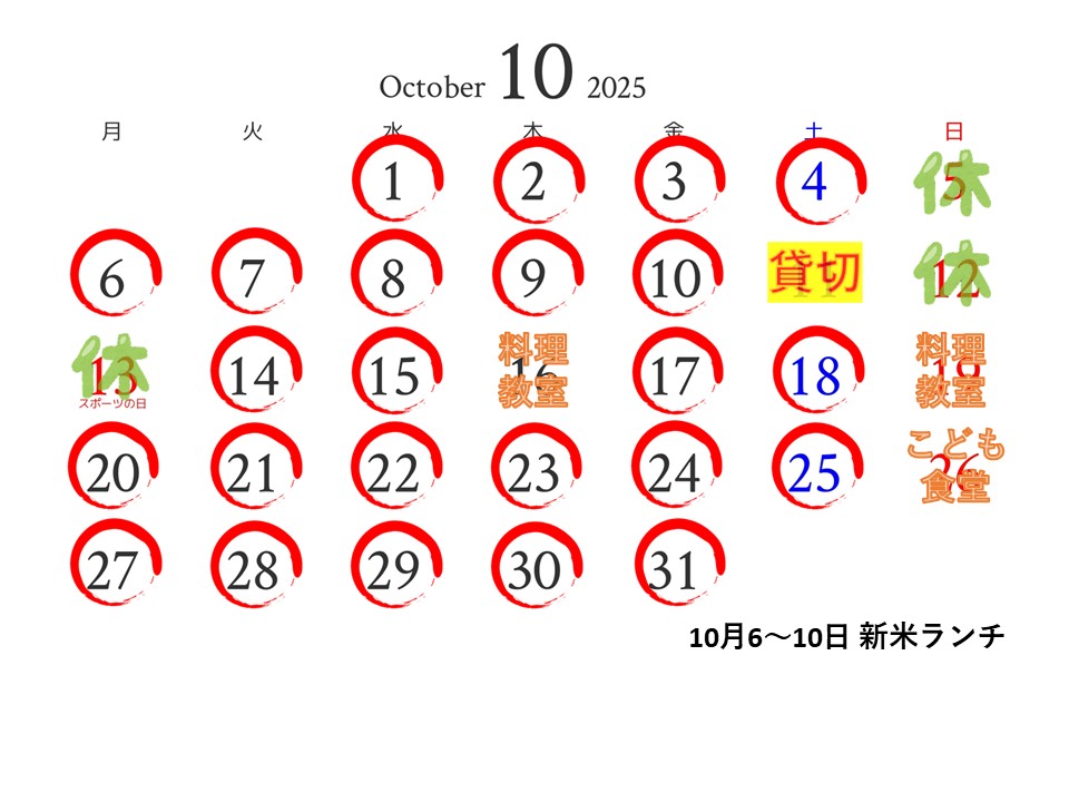10月の営業予定 2025.09.29 10月の営業予定です。 10月6日~10日 新米ランチ 10月11日 貸切営業 10月12日 母めしマイスター講座 10月16日19日 母めし料理教室 10月26日 こども食堂 となっています。 新しいお知らせへ 一覧で見る 古いお知らせへ