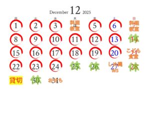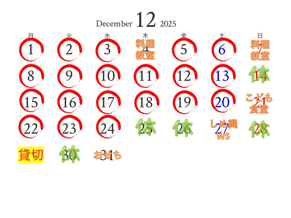 12月の営業予定 2025.11.29 12月の営業予定です。 4日(木)7日(日)母めし料理教室 21日(日)こども食堂 25日(木)~1月4日(日)年末年始休業 27日(土)しめ縄作りWS 29日(月)貸切り 31日(水)おせちお渡し 新しいお知らせへ 一覧で見る 古いお知らせへ